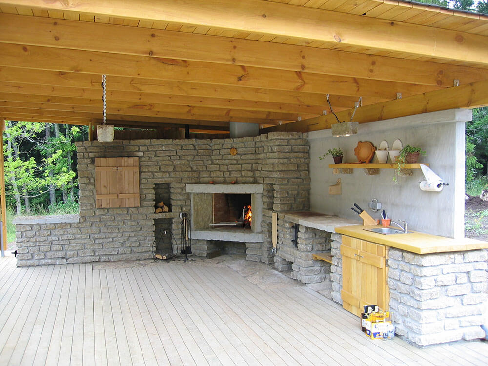 Soovitus. Kui sa mõtlesid, et teed köögi ja kamina ilma katuseta ehk ehitad aianurka lihtsalt tulekolde, siis pead arvestama, et su kamina planeeritav eluiga on 30 aasta asemel 10 ringis. Kui kamin on lageda taeva all, saab ilmastik sellest väga kiiresti jagu.